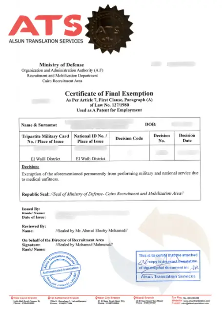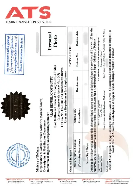 إثبات الموقف من الخدمة العسكرية: شهادة الجيش هي الوثيقة التي تُوضح موقفك من الخدمة العسكرية، سواء كنت قد أديت الخدمة أو كنت معفيًا منها، وتضمن ترجمتها بدقة أن جميع البيانات تكون واضحة ومقبولة لدى الجهات الرسمية.